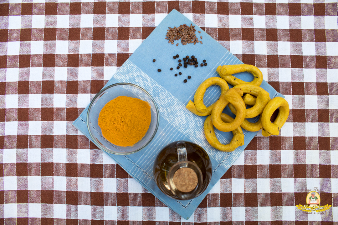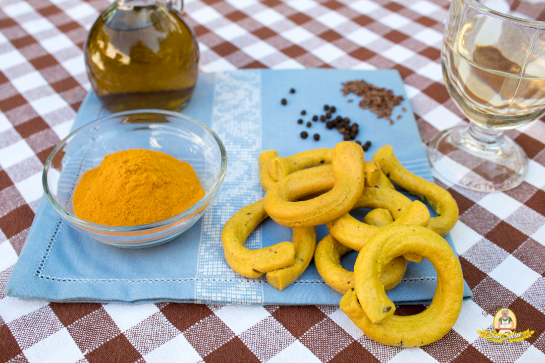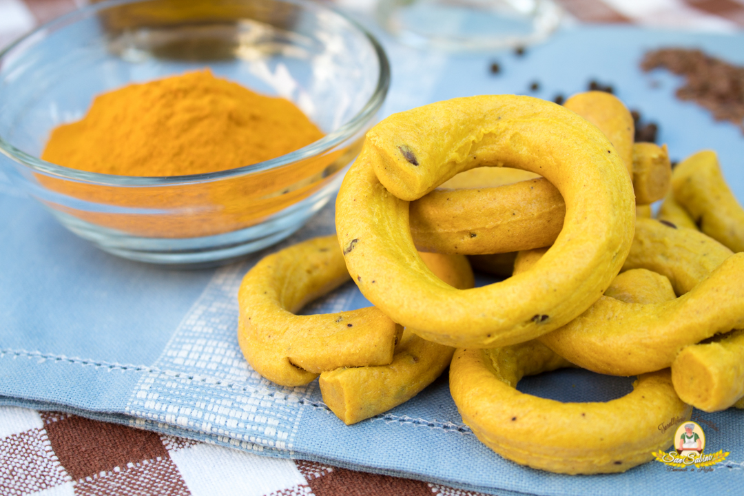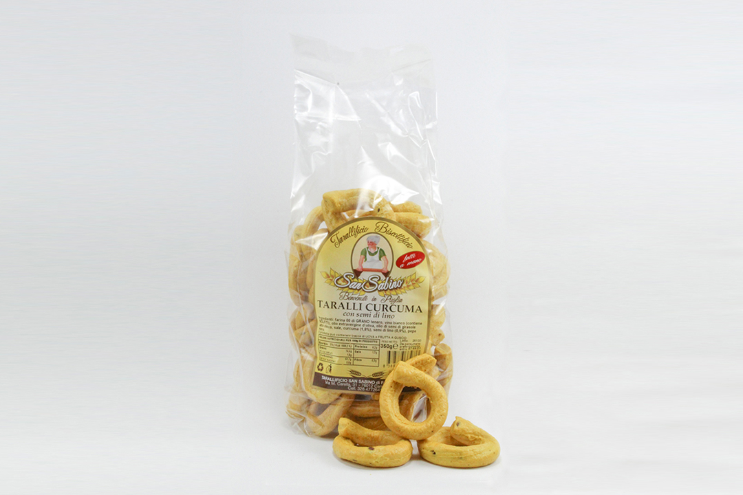 Dal sapore caldo e pungente della curcuma, combinata con le ottime proprietà dei semi di lino e la piccantezza del pepe nero. taralli alla curcuma sono perfetti per chi ama i sapori nuovi e sfiziosi.
